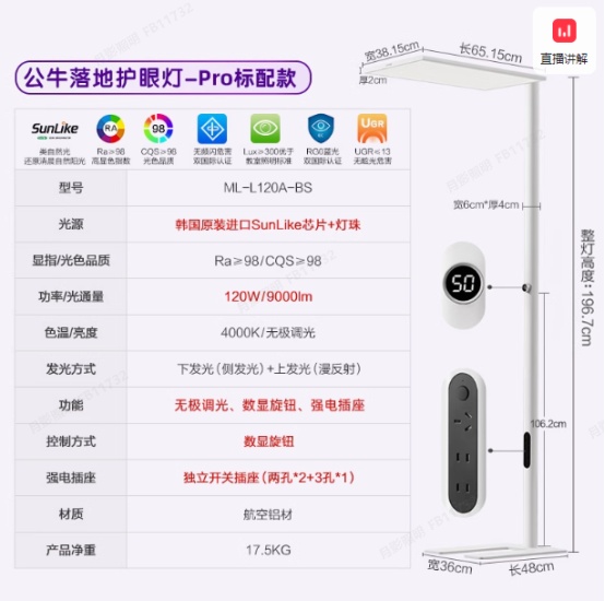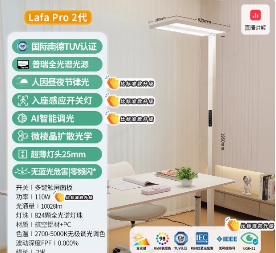护眼效果:采用全光谱光源与双边侧发光,广泛均匀照明,减少阴影,视觉压力小,满足8平米照明。但红光未补足,蓝光低,护眼效果一般。使用体验:外观精致,航空铝灯杆质感强,吸引注重工艺用户。旋钮无极调光,操作便捷,适应多场景光线需求。光学硬件参数:自主研发芯片,与普瑞芯片有差距。光线控制、稳定输出待优化,综合性能一般。