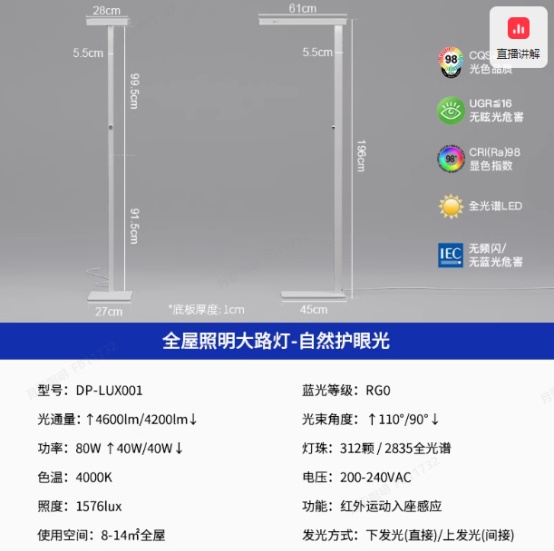 护眼效果:该路灯没有频闪和蓝光伤害,还能有效去除眩光,进一步保护了用户的眼睛健康。自主研发芯片,与普瑞芯片有差距。使用体验:德普大路灯具有智能调光功能,能够检测人体靠近的距离,自动调整光亮程度。这种智能化的设计不仅提高了使用的便利性,还能有效节省能源。由于德普大路灯的体积较大,重量较重,移动起来可能不太方便。因此,在安装时要选择合适的位置,避免频繁移动。部分用户反映,该路灯的自动调光功能有时可能不够灵敏,需要手动调整才可以做到理想的亮度。光学硬件参数:德普大路灯的显色指数高达98%,能够非常好地还原物体的真实色彩,为用户所带来更真实的视觉体验。在某些特定环境下,如光线过强或过暗的场所,在大多数情况下要用户手动调整亮度才可以做到最佳的照明效果。