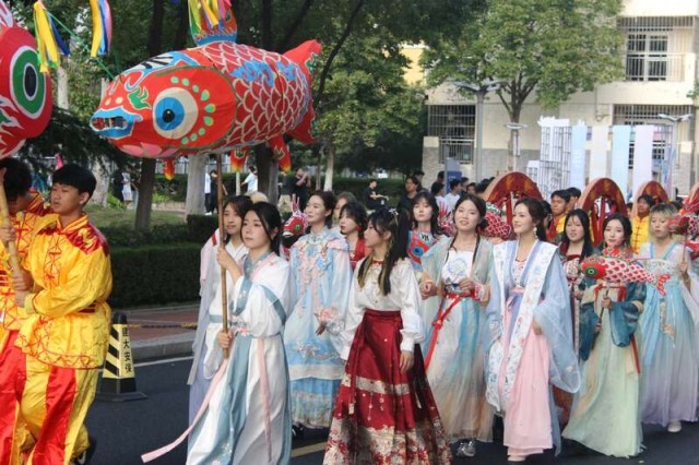 本次活动共分三个单元内容。一是“春风更放花千树”,包含傩戏面具、木刻版画、绒花、风俗服饰等徽州传统工艺品非遗文创展现,大幅藤编、大型鱼灯、大型剪纸等传统艺术作品展,以及书法、国画、葫芦描写等手工艺作品展;二是“玉壶光转舞鱼龙”,在热烈的锣鼓声中,鱼灯巡游、轩辕滚车、舞龙舞狮从学校光启堂动身,最终会聚日月广场;三是“九霄钧乐奏云韶”,青年师生展开黄梅戏展演,表演《天仙配》《女驸马》等闻名唱段。